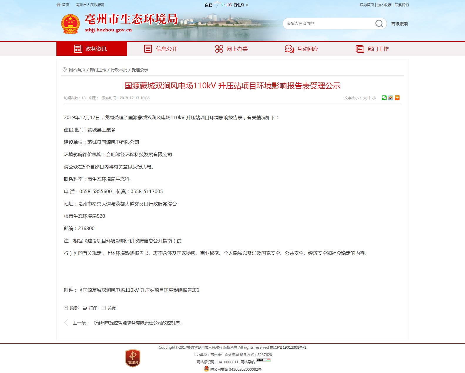 国源蒙城双涧风电场 110kV 升压站项目环境影响评价工程